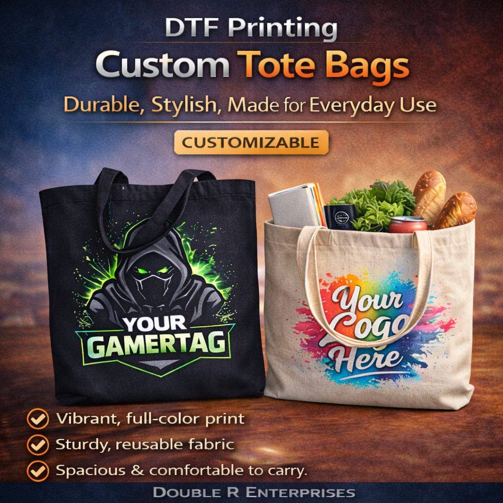 Carry your essentials in style with our Custom DTF Tote Bags. Made from strong, reusable fabric and finished with vibrant, long-lasting prints, these totes are perfect for daily use while showcasing your custom design.
